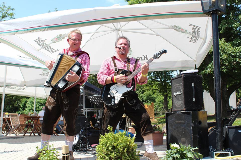 2 Leadsänger die sich mit Trompete, Posaune, Gitarre, Akkordeon und Keyboard
